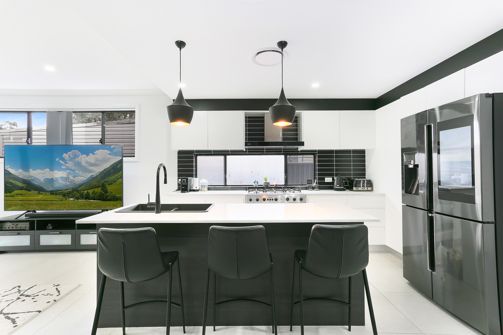 - Designer kitchen with stone benchtops, stainless steel gas appliances and dishwasher