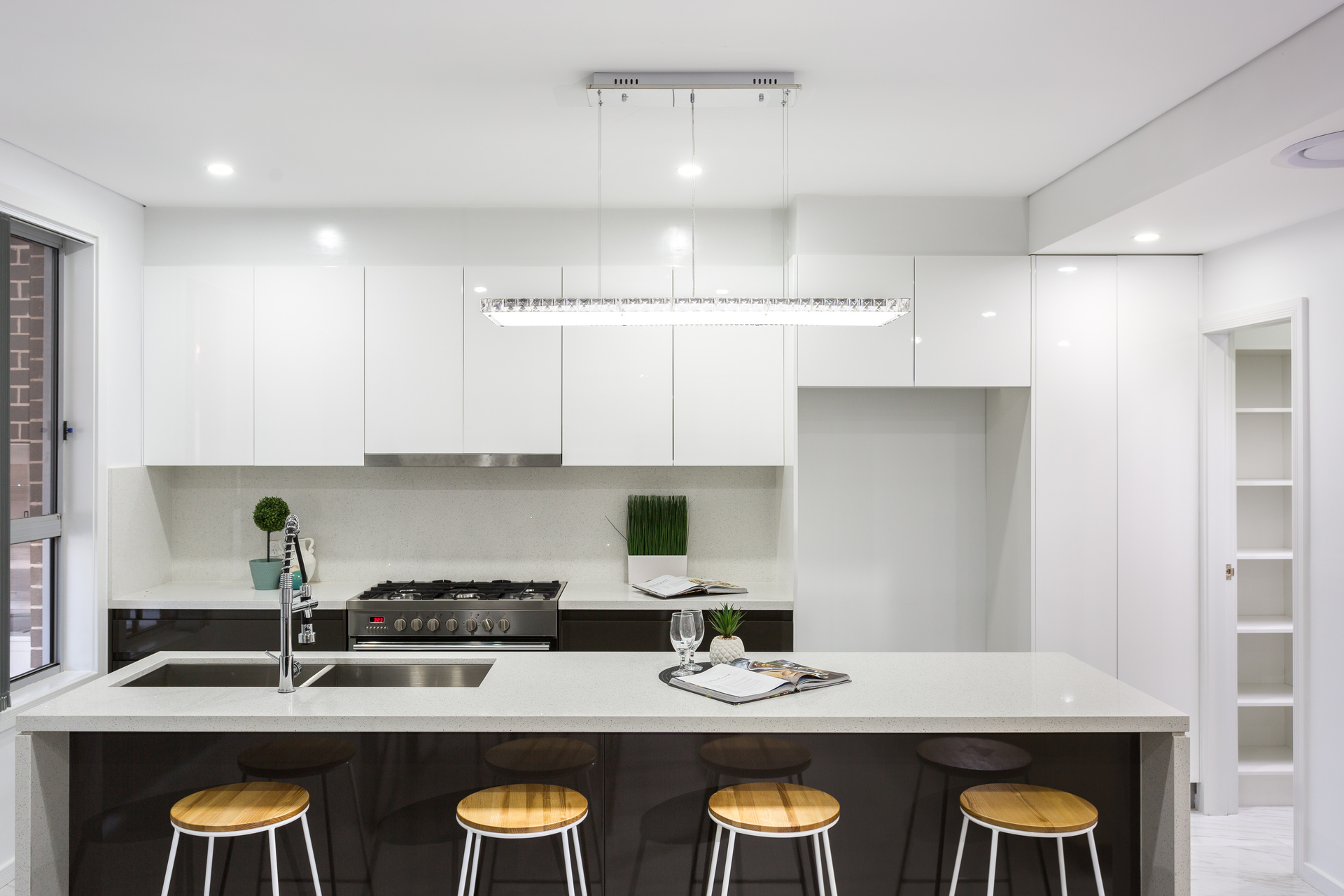 - Designer kitchen with stone benchtops, stainless steel gas appliances and walk in pantry