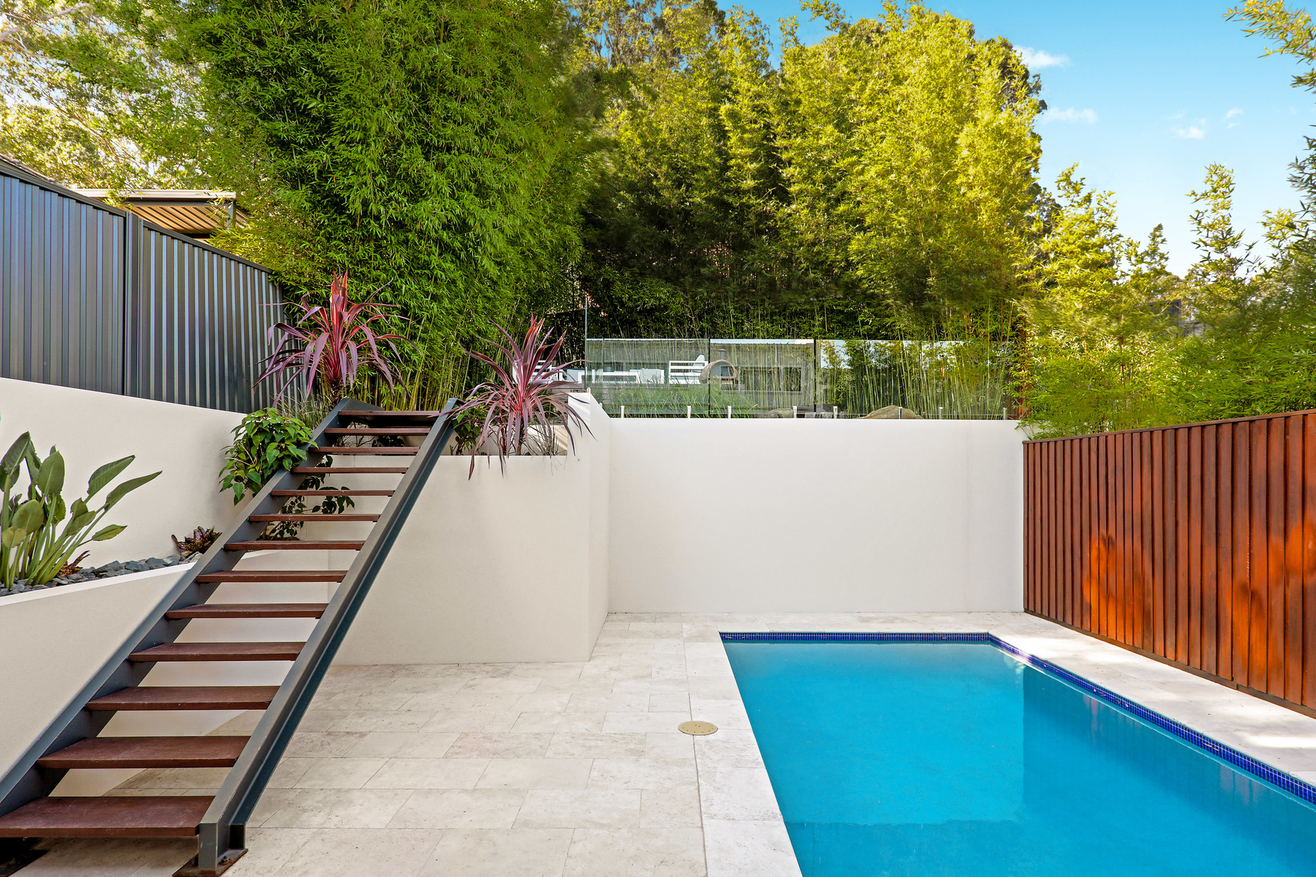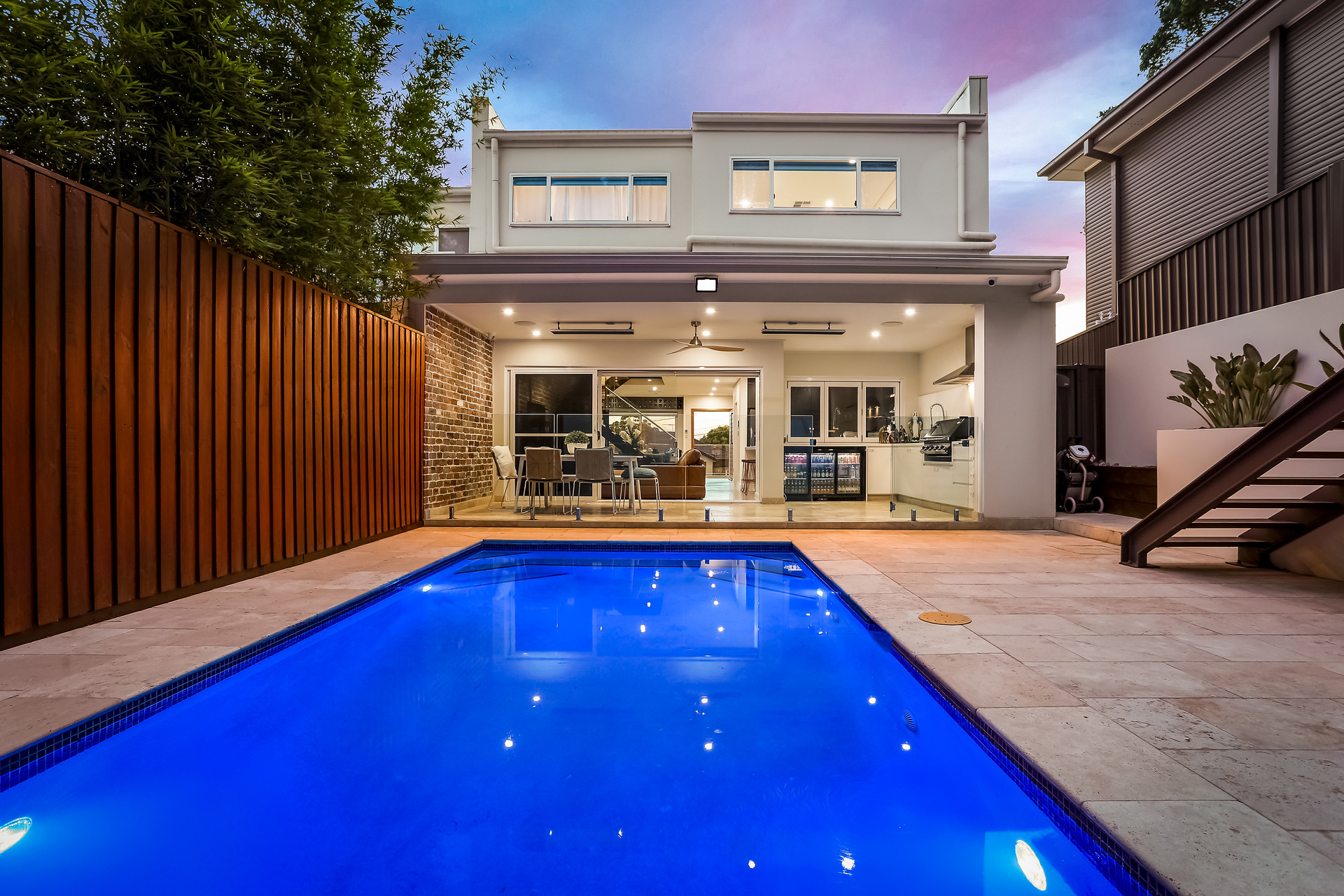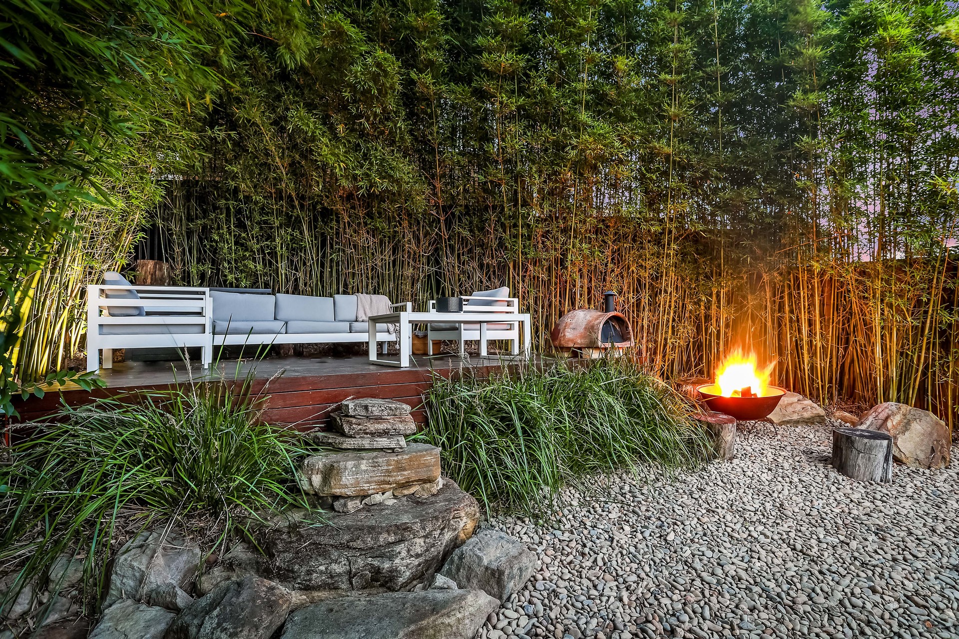 Vibrant outdoor living with LED pool lighting & garden with fire bowl