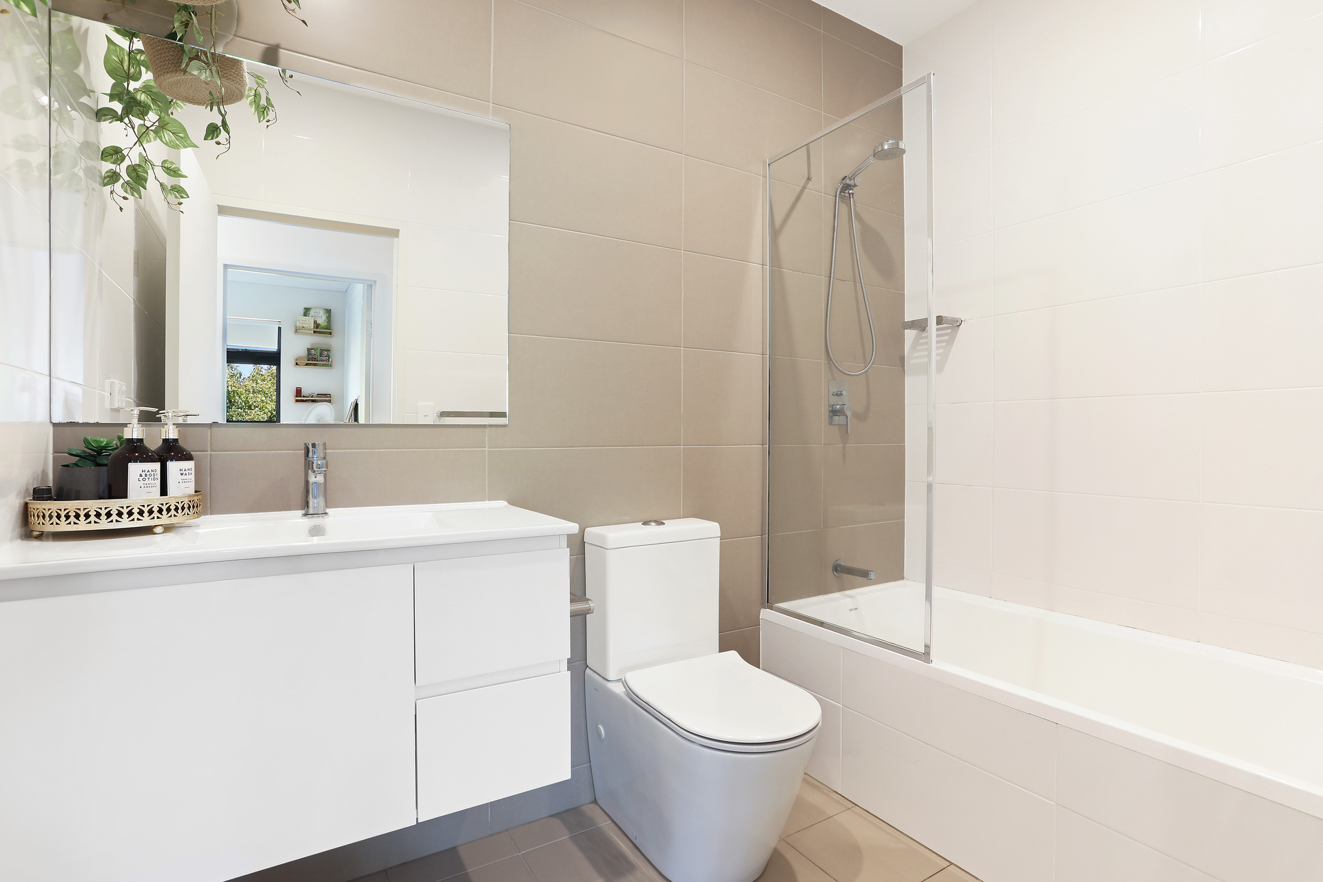 * Fully tiled bathroom with combined bathtub & shower