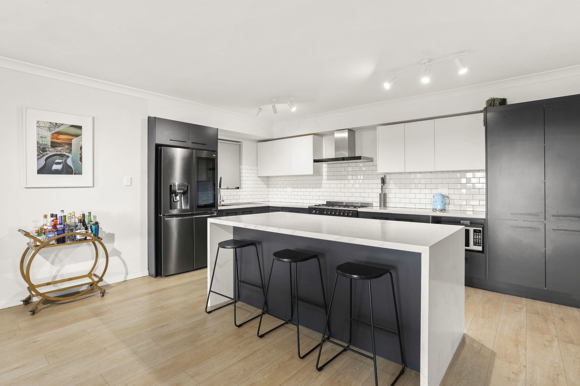 * Kitchen with stone bench tops, gas cooking, integrated dishwasher and an abundance of cupboard space