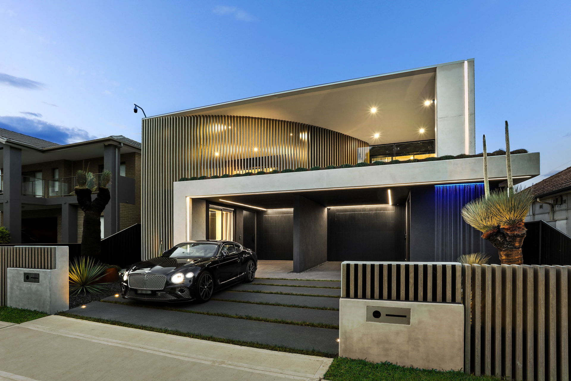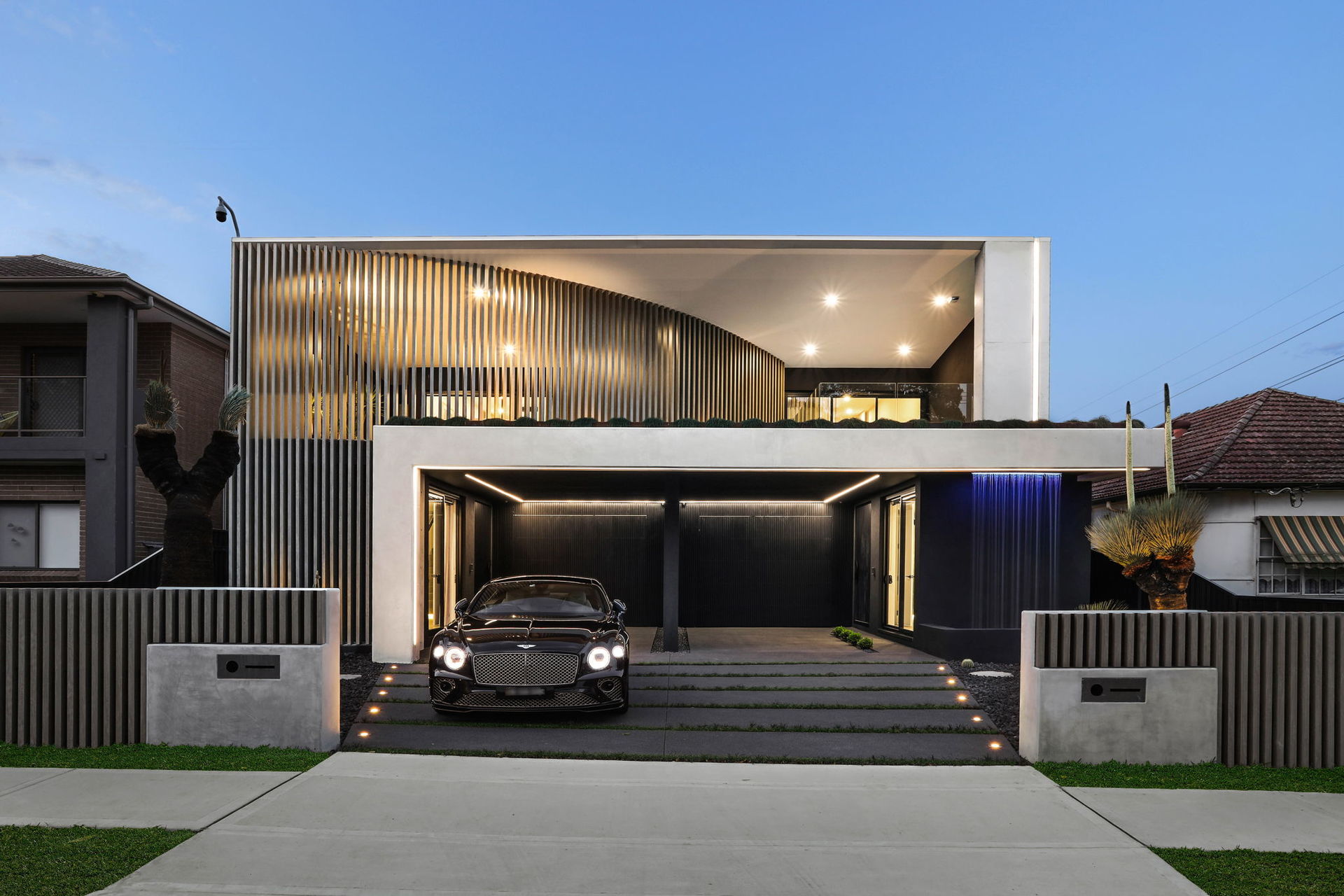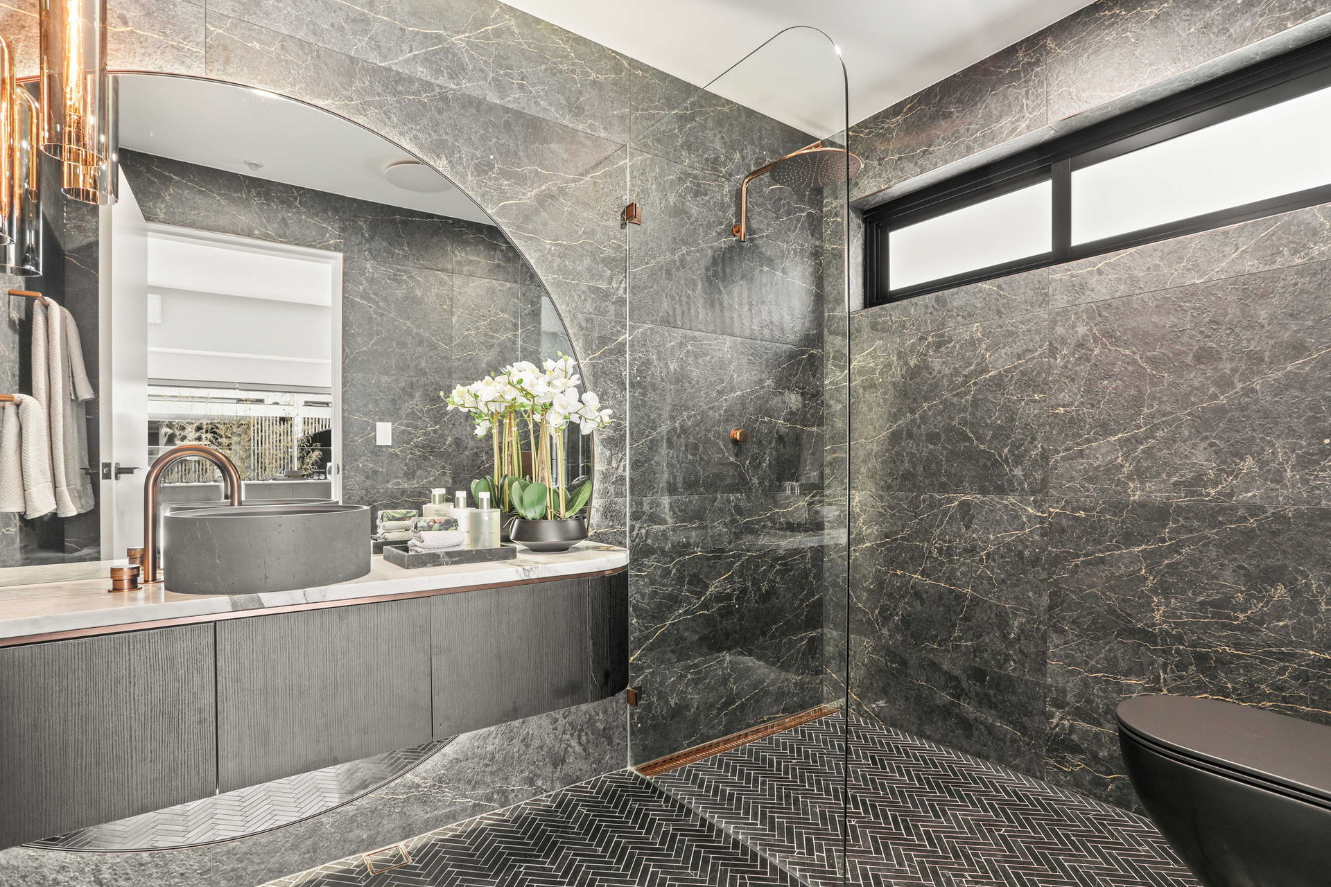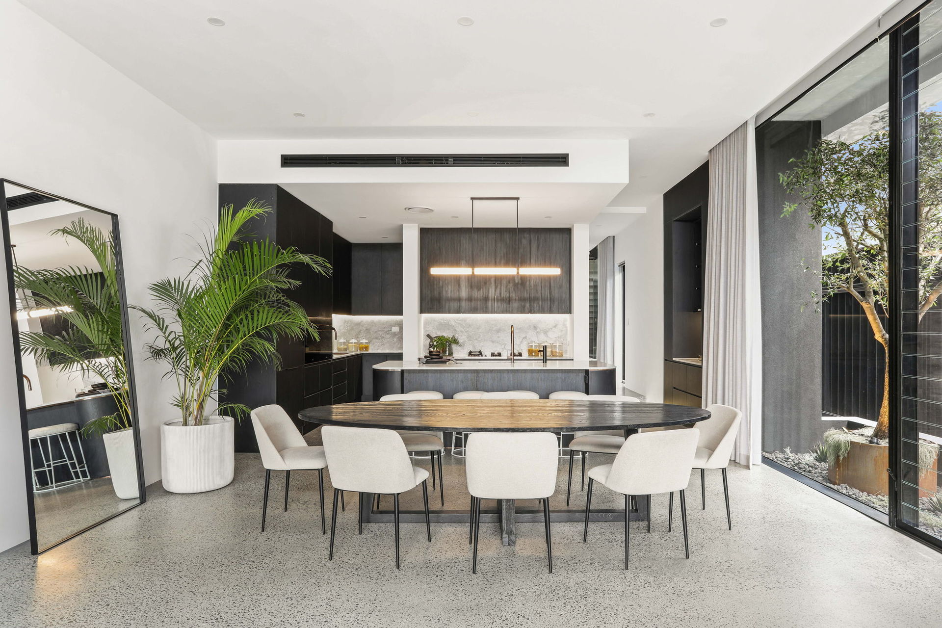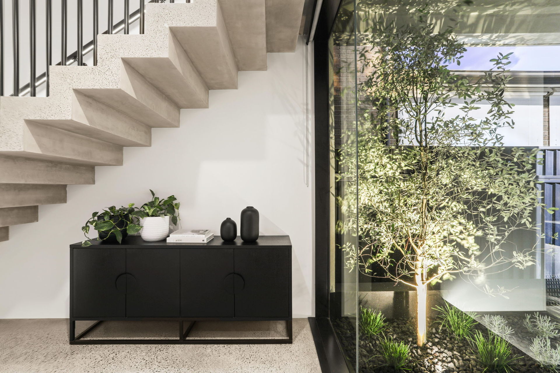 The artistic façade makes a stunning first impression in a home that achieves visual impact in every single space. Common areas blend polished concrete and a selection of marble finishes, while commercial glazing is used to frame landscaped elements as living artforms.