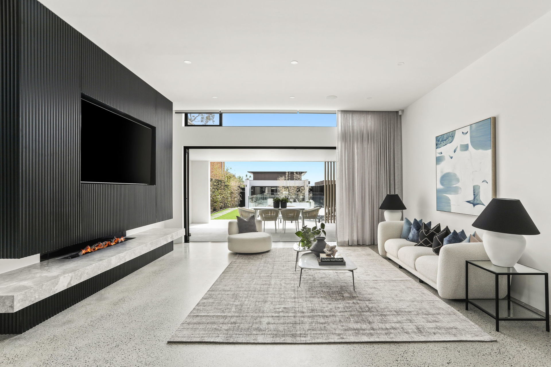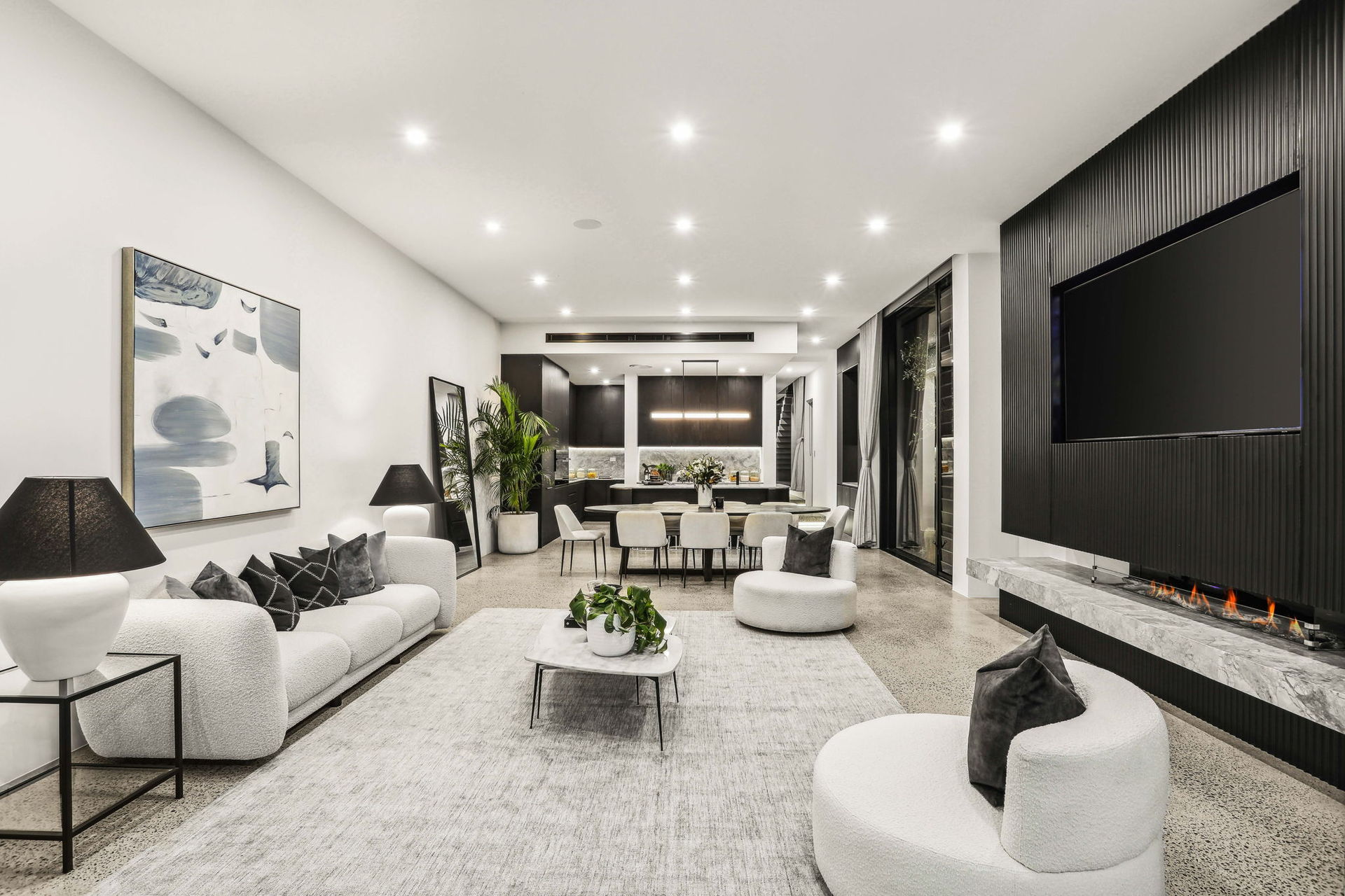 Elegant formal lounge and dining with designer pendants and cantilever marble fireplace
