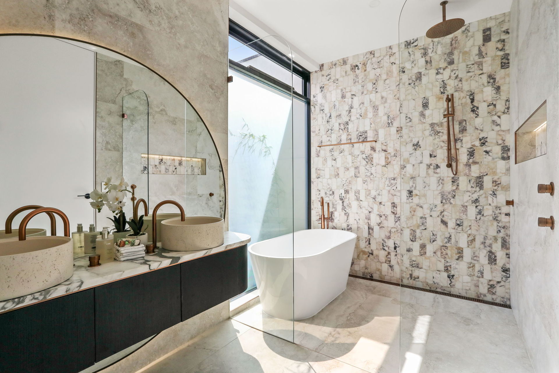 Unique bathrooms with eclipse effect for vanity mirrors, Calacatta Gold feature walls