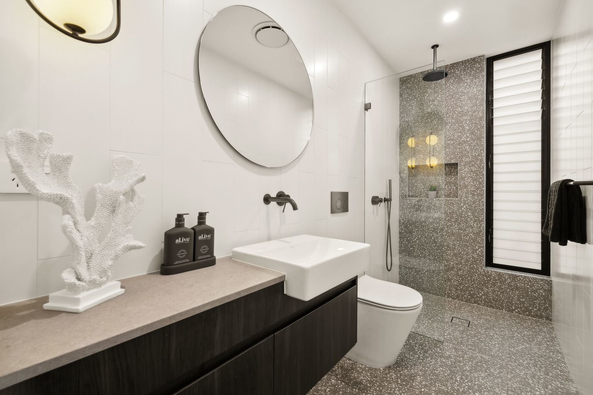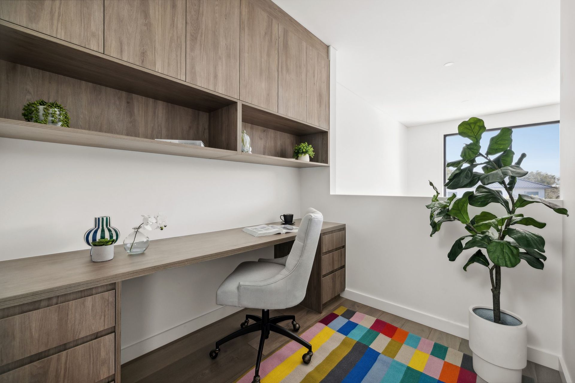 Retreat to the second floor, where the spacious bedrooms and study room also enjoy an abundance of natural light. The master bedroom is a luxurious haven. It boasts a double shower and vanity ensuite, a bespoke walk-through robe, and a spacious sleeping area. Full-height windows fill the room with natural light. The bathrooms and ensuites feature, stone vanities Parisi tapware and resort-like double showers. The secondary master bedroom with a two-way ensuite is conveniently located on the ground floor.