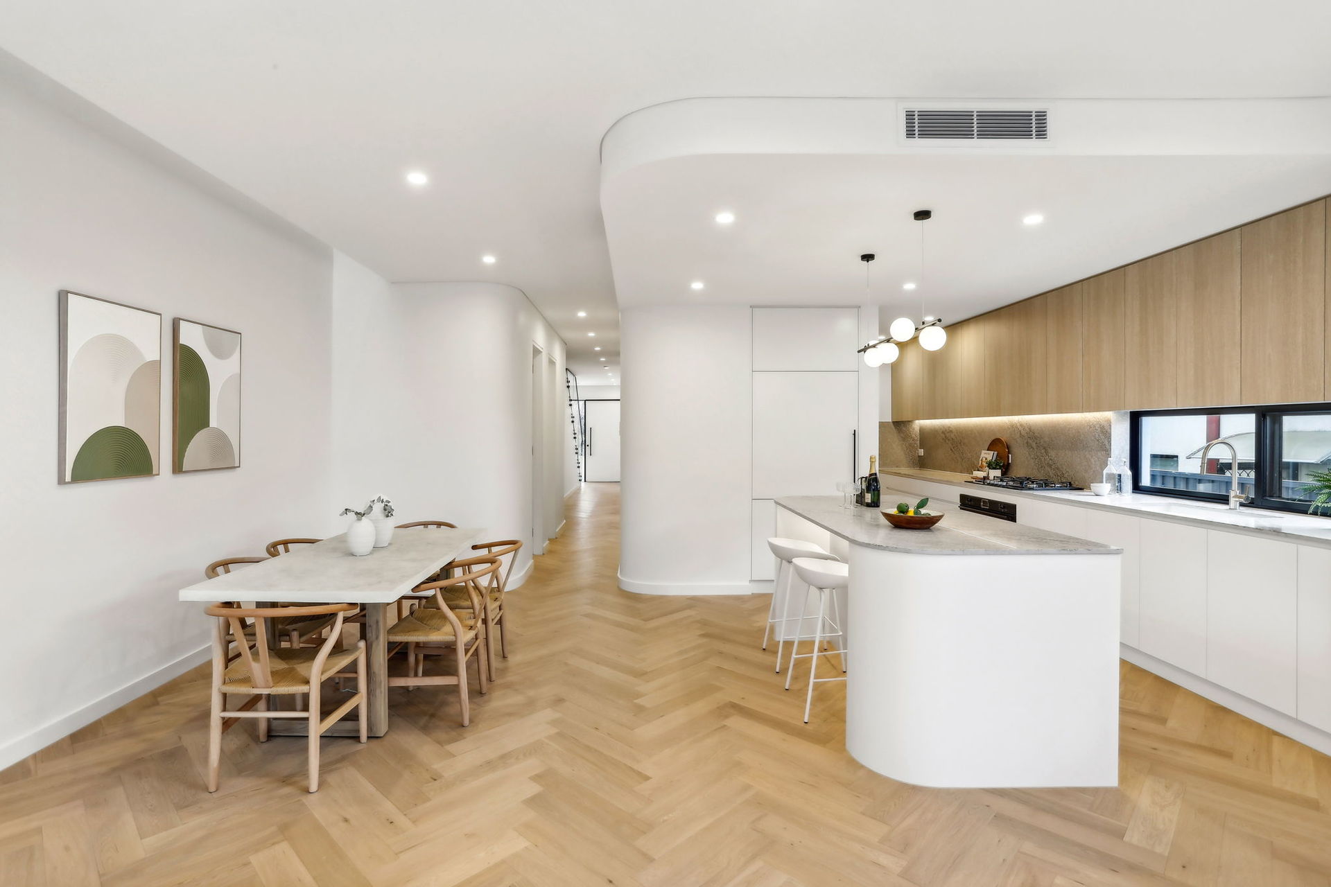 Step inside and be captivated by the seamless herringbone timber flooring that flows throughout the home, setting the tone for the refined elegance that defines this property. Boasting five generous-sized bedrooms, including a convenient ground-floor suite with an ensuite, this home provides ample space for the whole family.