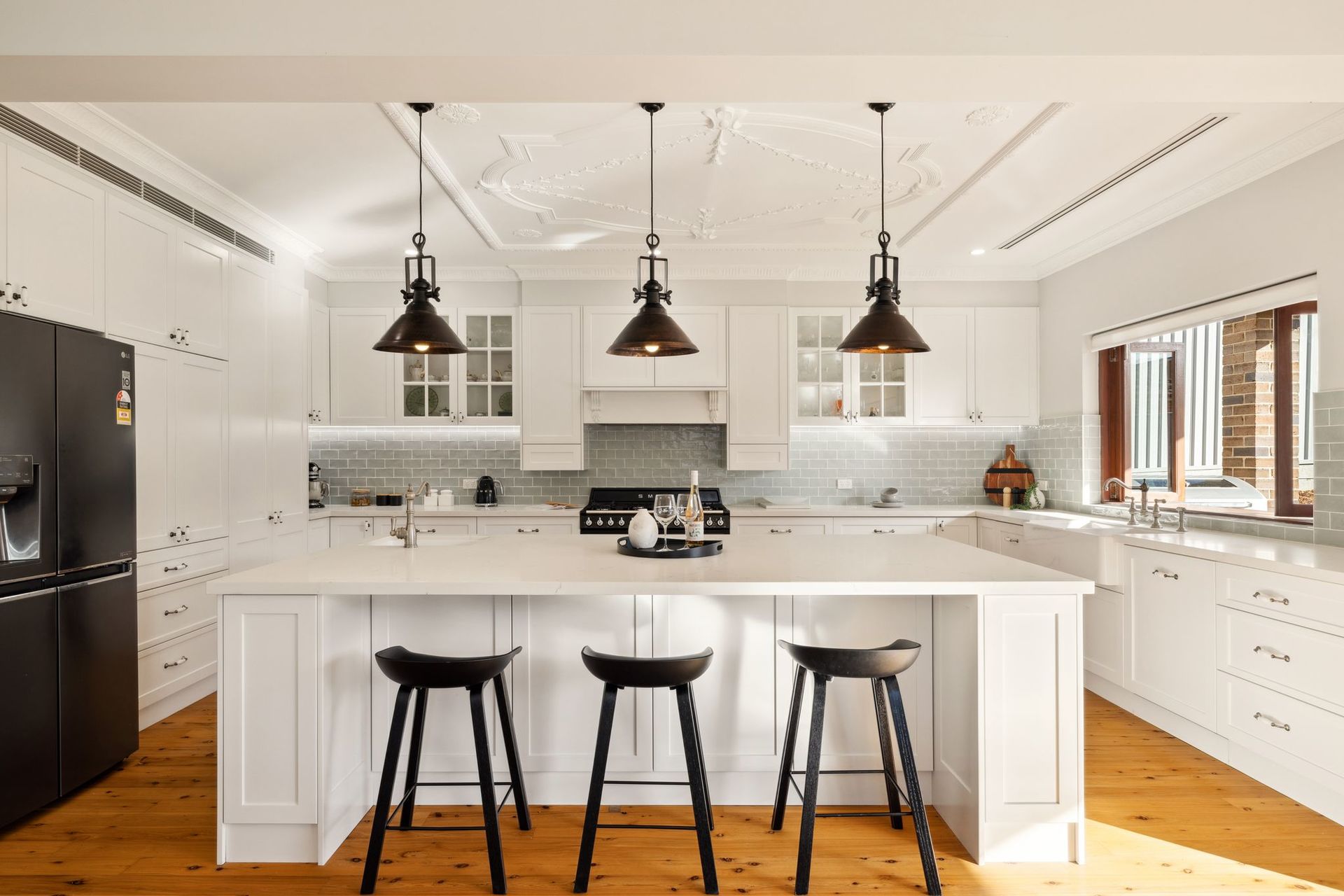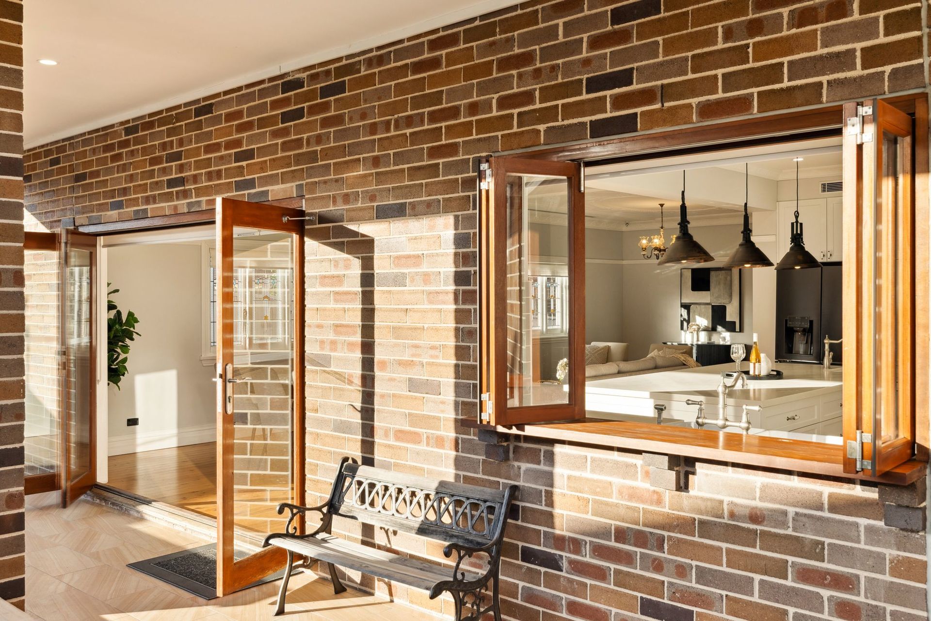 • Gourmet Kitchen: A true chef's delight, the kitchen boasts a Turner Hastings Butler's sink, an oversized island, Perrin & Rowe tapware and a walk-in pantry. The large servery window leading to the patio is perfect for seamless indoor-outdoor entertaining. LED-featured lights under the cabinets add an extra touch of style.