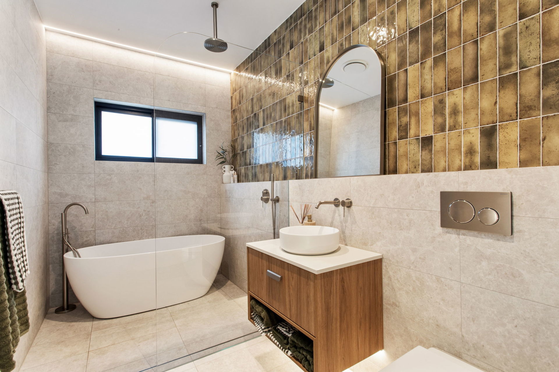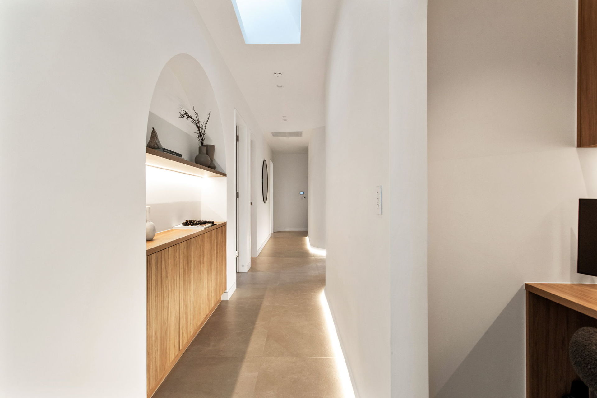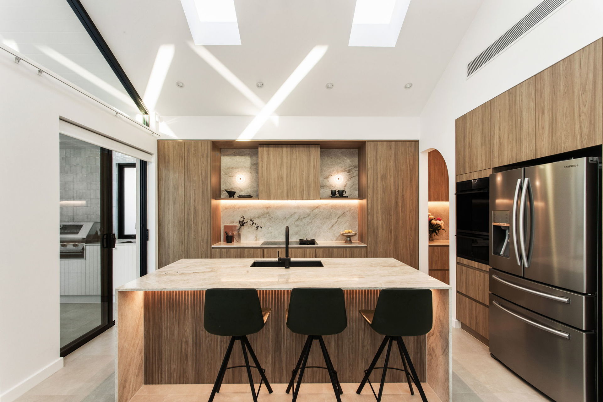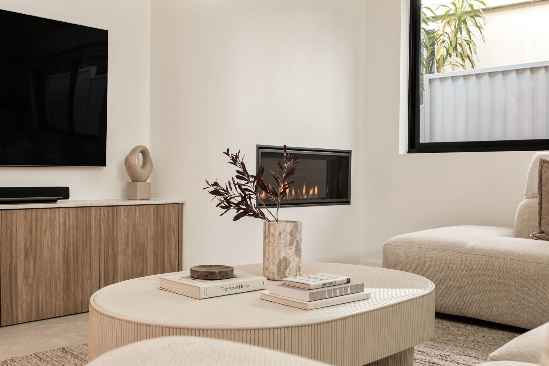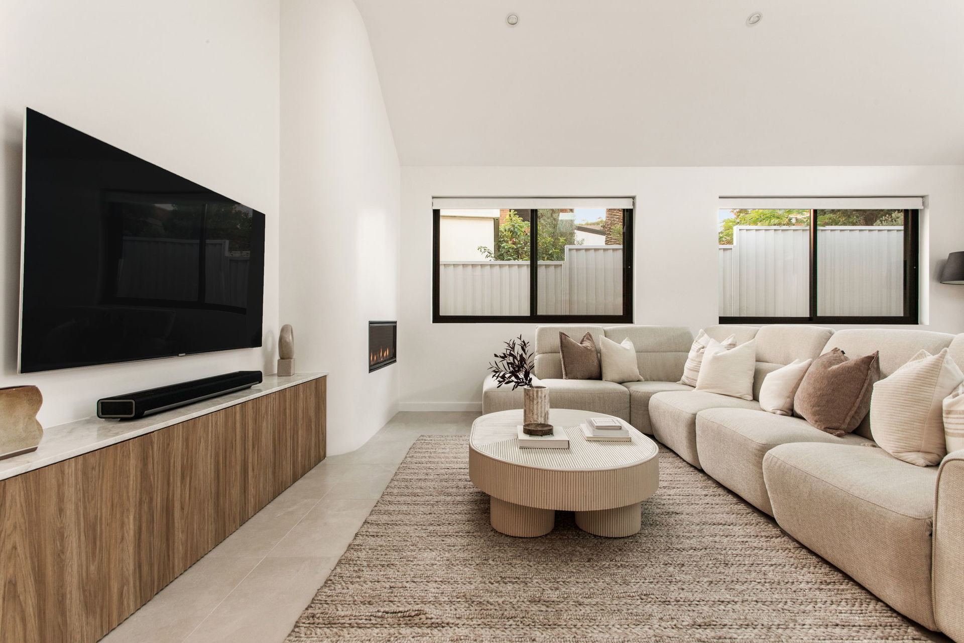 From the moment you step inside, you're greeted by a palette of warm, earthy tones and dramatic high-pitched ceilings. Every corner of this residence has been masterfully curated, from the Taj Mahal stone benchtops flowing across the kitchen, butler's pantry, and living areas, to the Mezzo 1000 gas fireplace that anchors the heart of the home in both warmth and style.