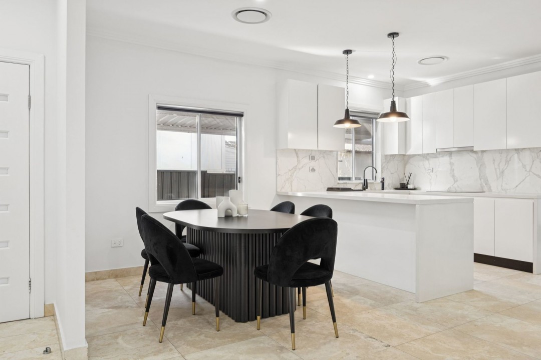 The heart of the home is the bright open plan living, dining, and kitchen area, designed for effortless family living and entertaining. The contemporary kitchen features sleek finishes and a functional layout.