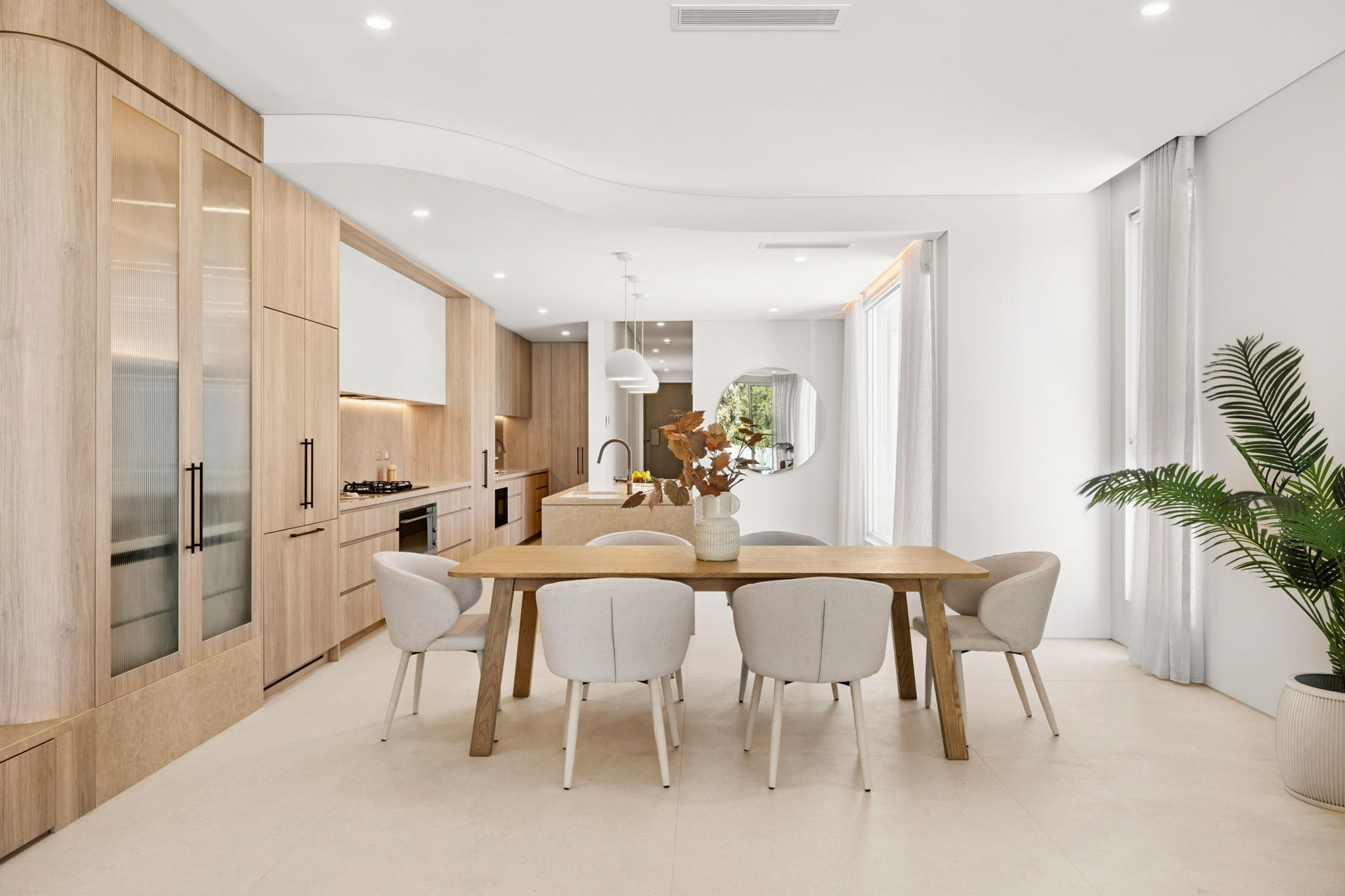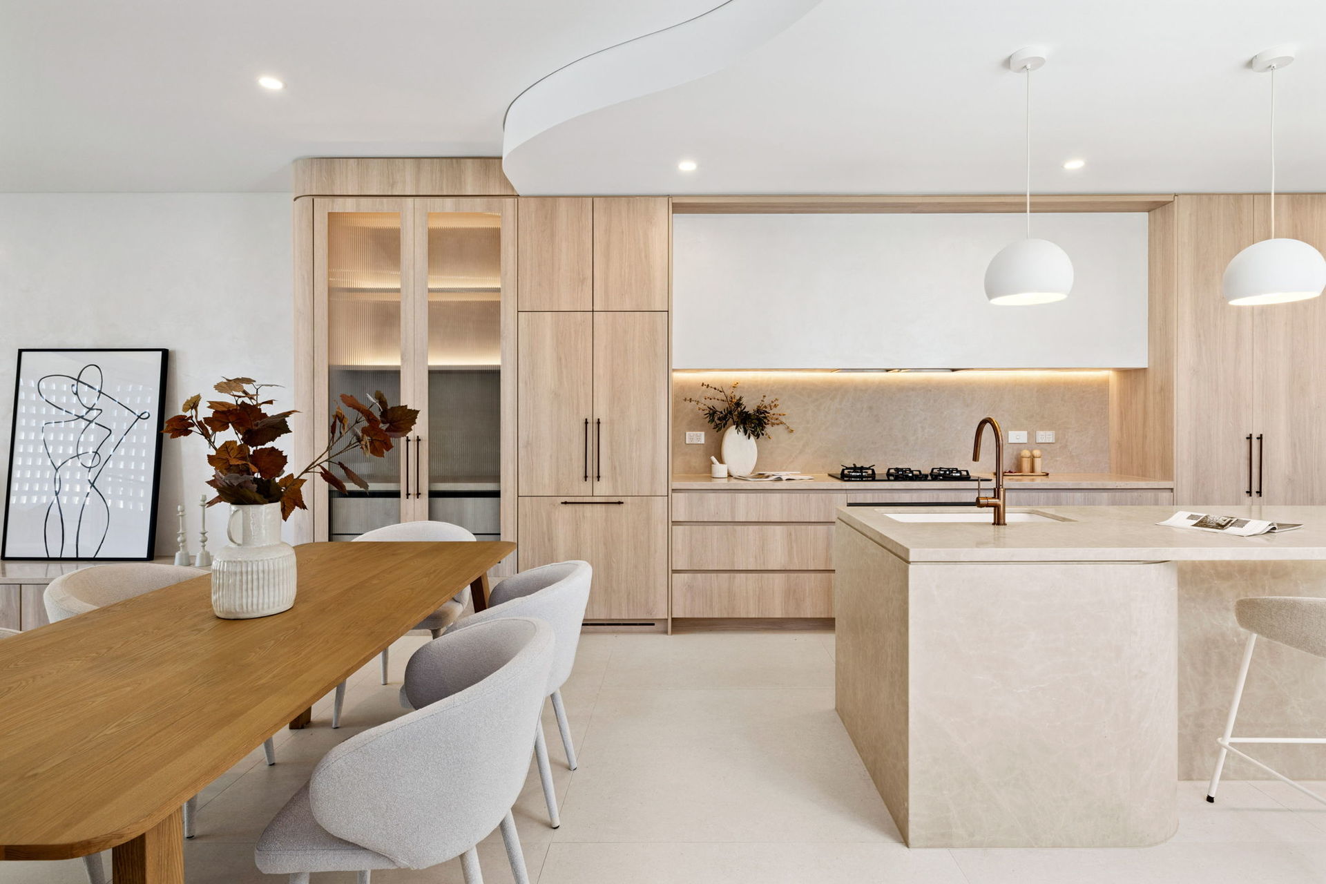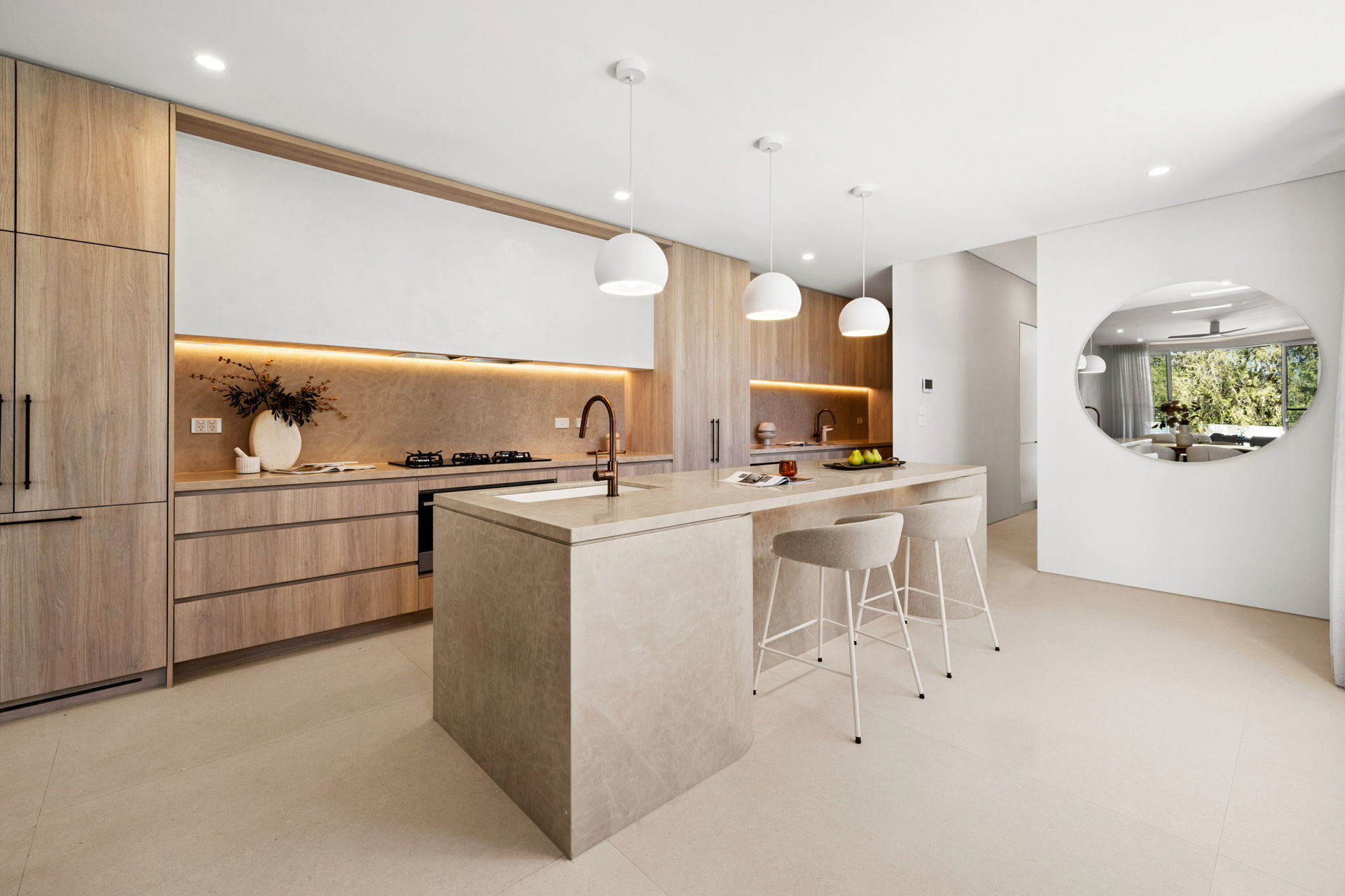 • Gourmet gas kitchen showcases Navurban Balmoral joinery, natural marble Ivory Beige stone benchtops, a Bosch appliance suite including oven, microwave, five-burner cooktop and dishwasher, a large island breakfast bar, generous walk-in pantry, and Billi HydroTap for instant hot and chilled water.