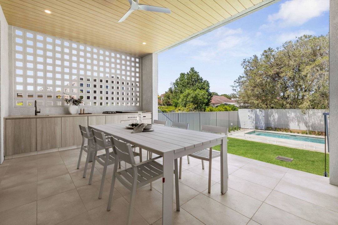 • Expansive open-plan living and dining zones are flooded with natural light, featuring a gas fireplace and seamless flow to a covered alfresco terrace with Biowood timber ceiling detail, breeze-block feature wall, and built-in BBQ perfect for effortless entertaining.