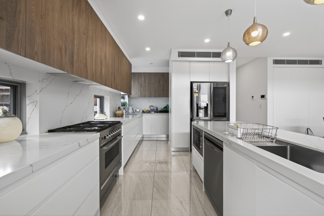 At the heart of the home is a spacious, light-filled kitchen, complete with quality appliances, generous bench space, and a butler's pantry providing excellent storage and prep space. The kitchen adjoining onto a large, open plan living and dining area is perfect for entertaining.