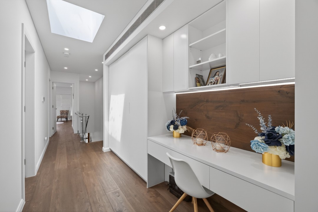 A dedicated study nook upstairs makes working or studying from home easy and practical. Skylights enhance the natural light, creating a bright and welcoming living environment.