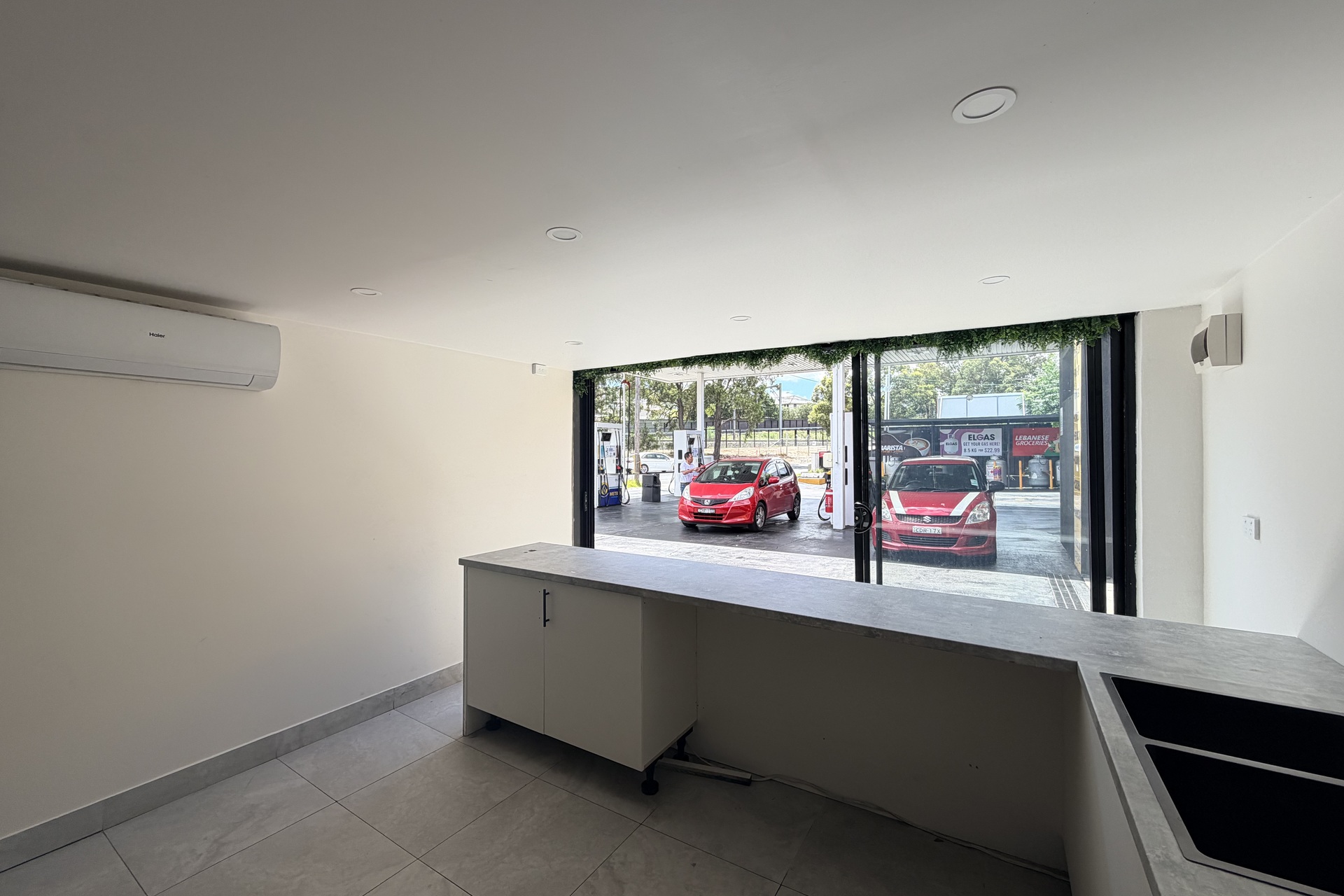 Compact tiled retail space available for lease within a high-traffic service station. The premises includes built-in bench space and a sink, making it suitable for food or beverage preparation. Bathroom access can be arranged by agreement.