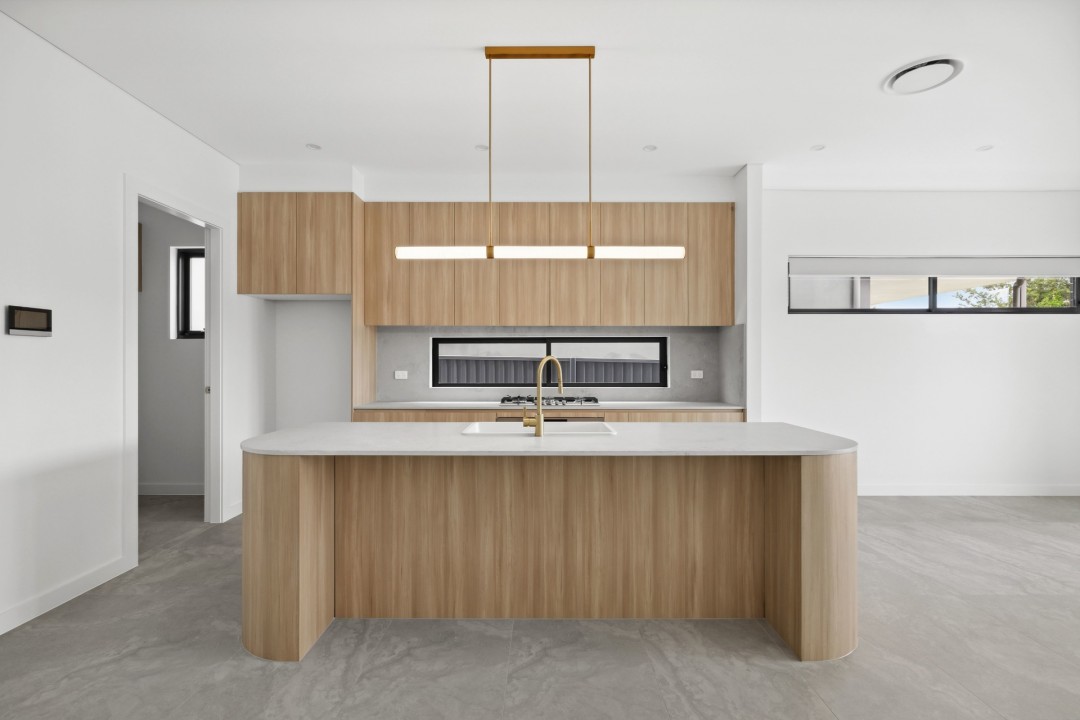 - Luxury kitchen with high end finishes, stone bench, timber look, dishwasher, microwave, 90cm gas cooking, walk in pantry