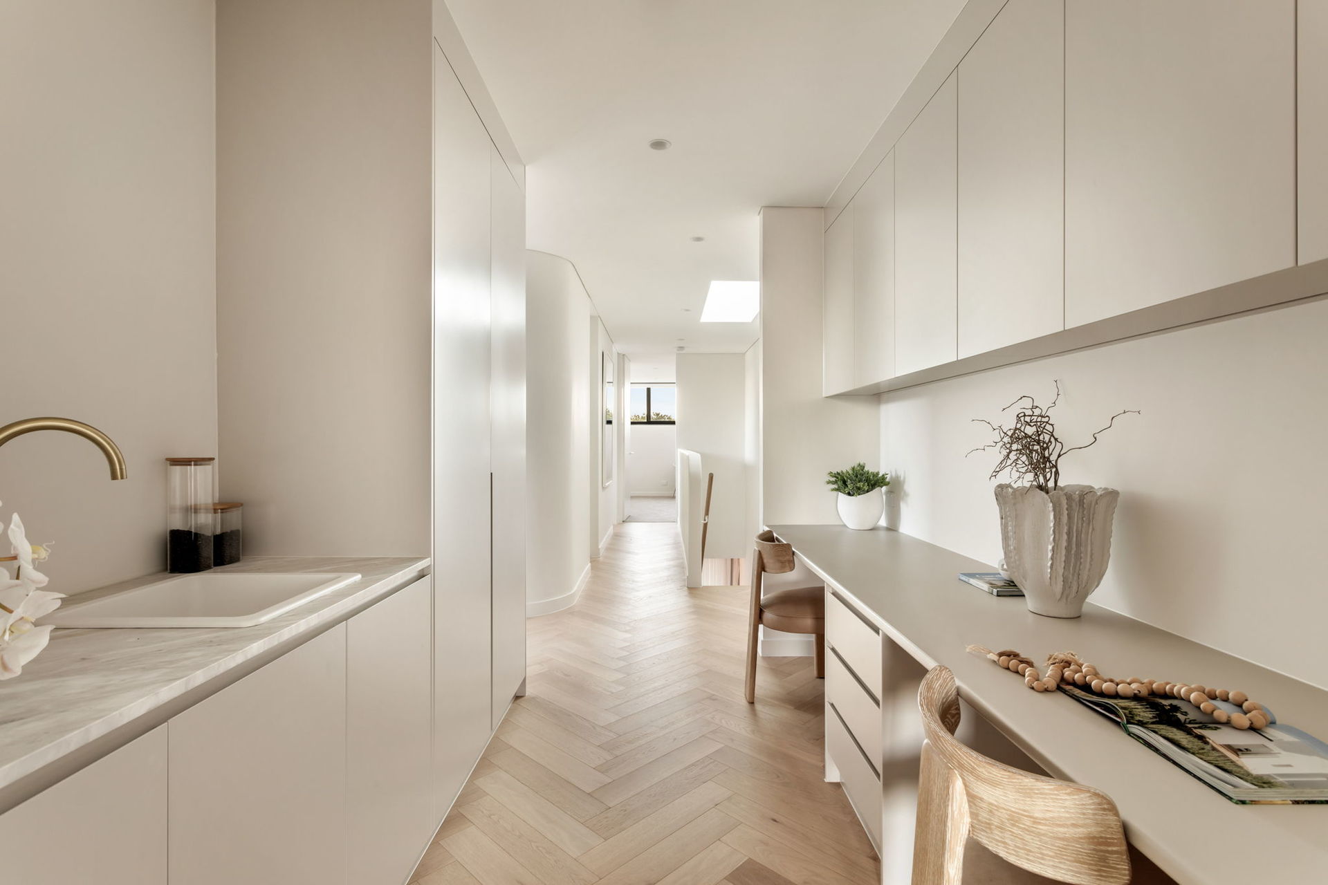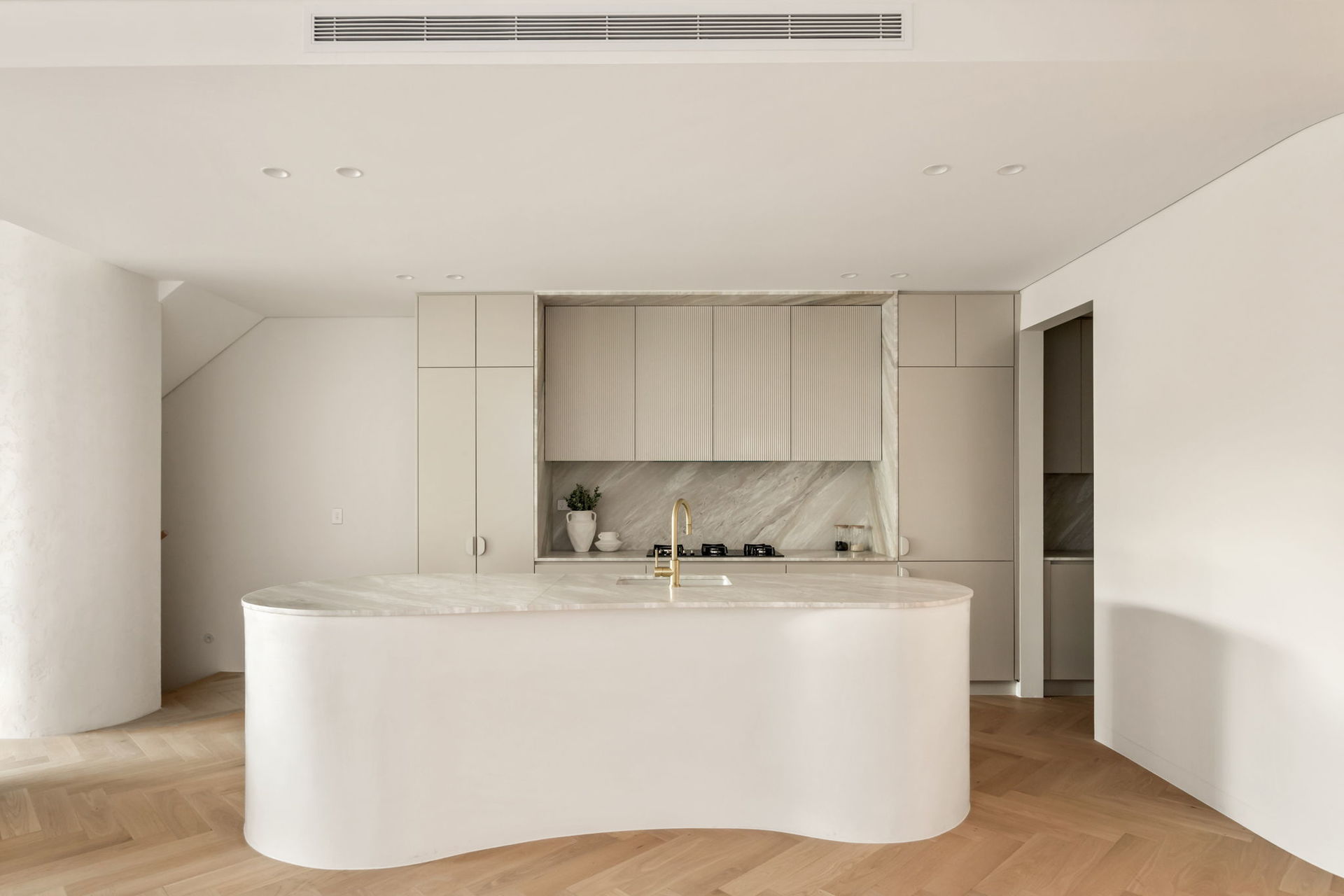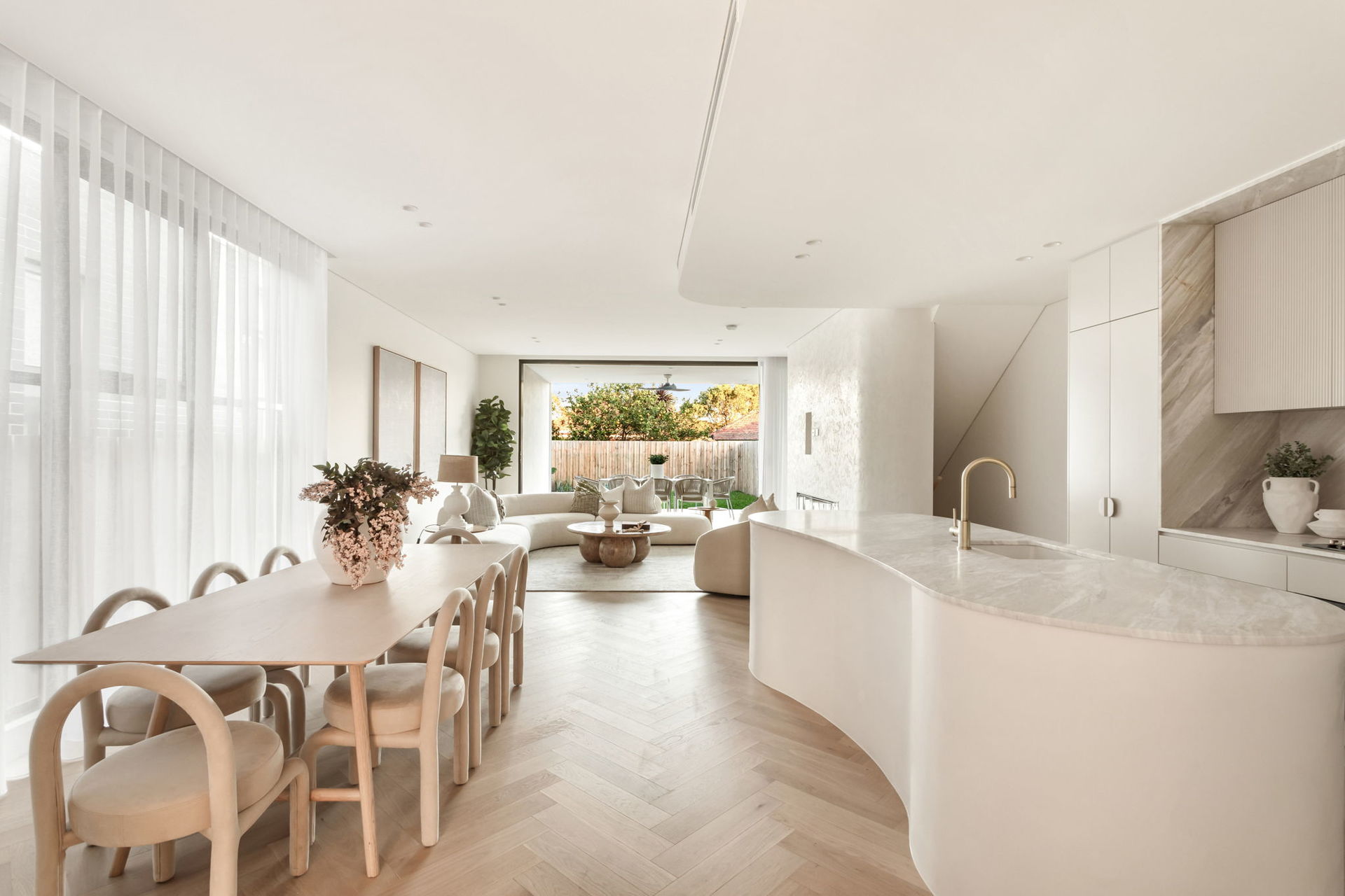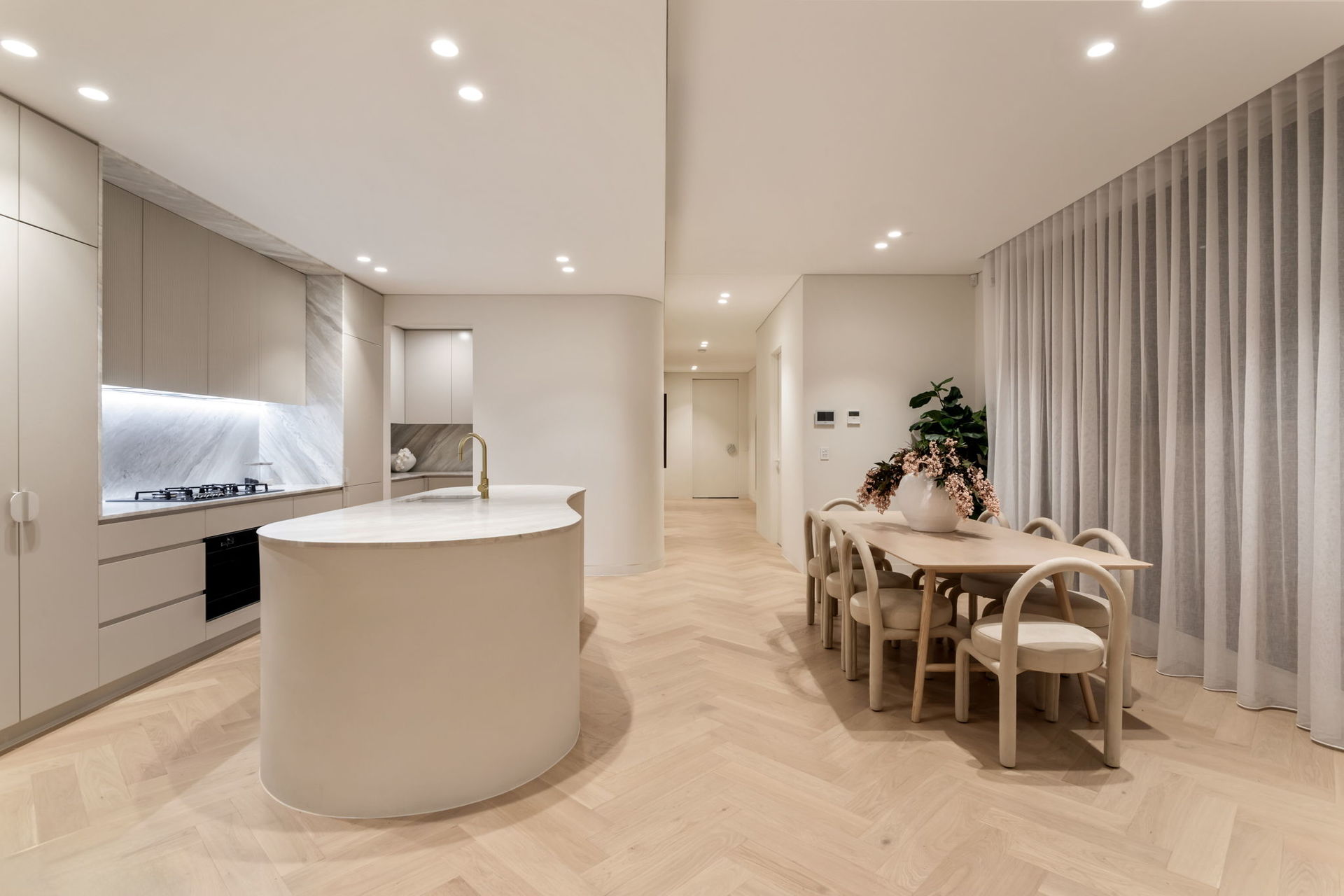 Elegantly curved island, sleek black Smeg appliances, Billi tap in butler's pantry