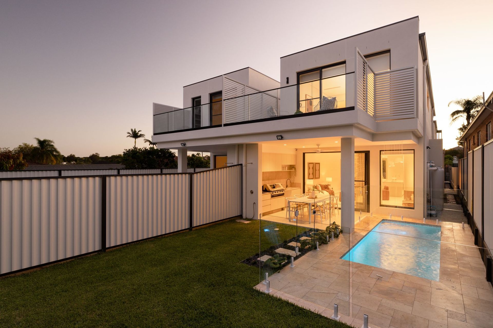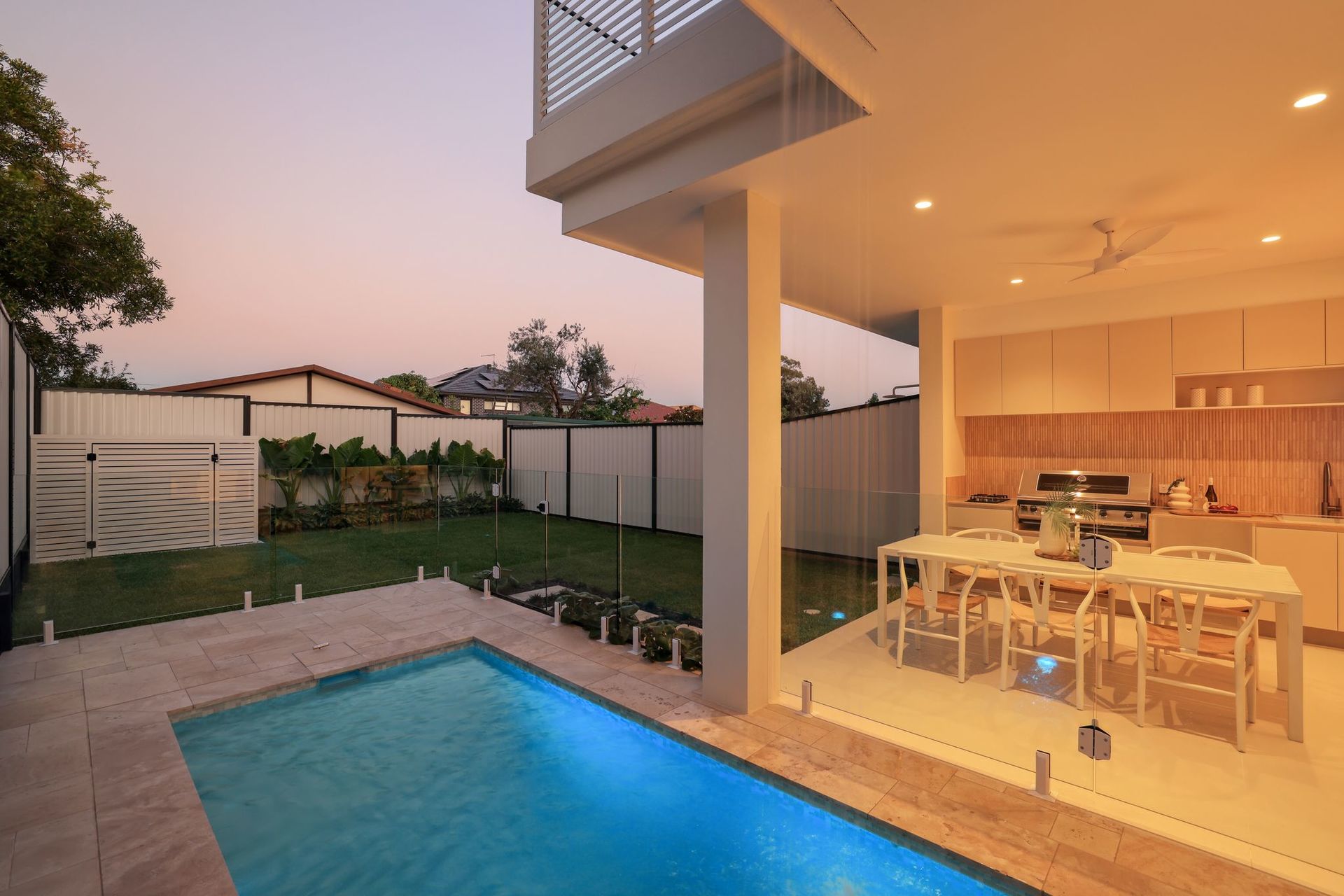 The open-plan layout flows seamlessly into a gorgeous alfresco area, which overlooks a sparkling pool with a serene waterfall feature an entertainer's dream. Upstairs, the luxurious master suite boasts a spacious walk-in robe and an opulent ensuite, creating a private retreat. The remaining three generous bedrooms, all with ample storage, offer comfort and style, with one back bedroom featuring a walk-in robe and its own private balcony, showcasing breathtaking gun barrel views of the city CBD.